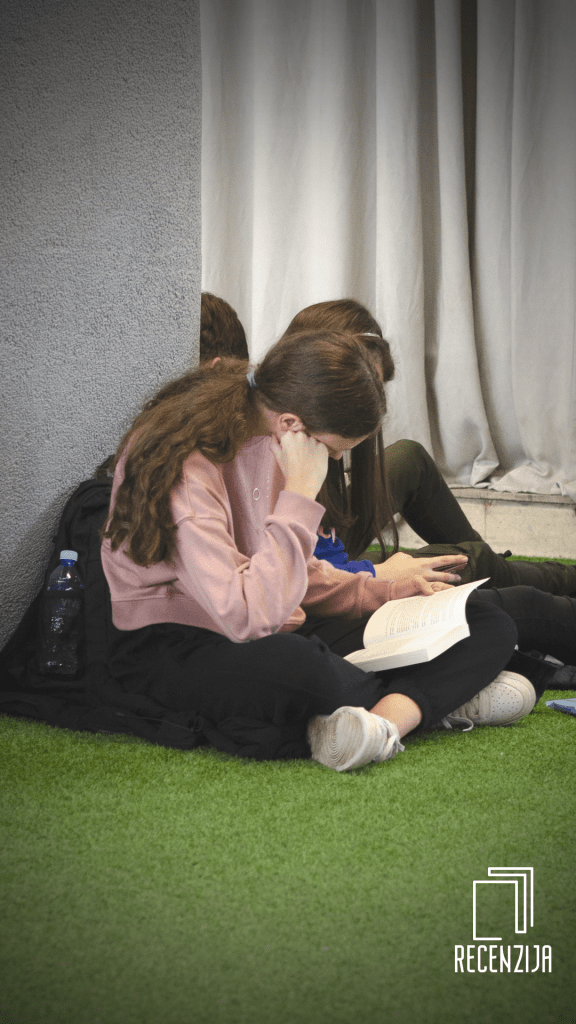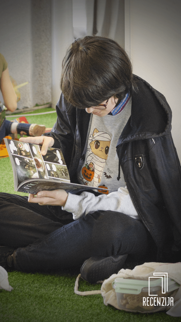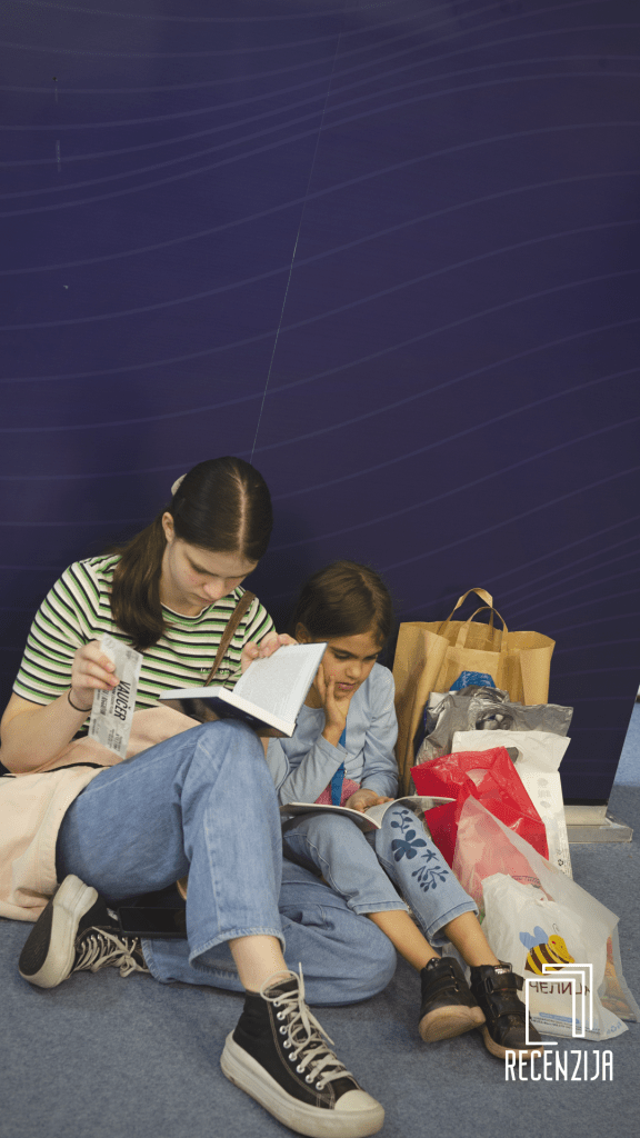 Gužva na sve strane ali nisam ni u jednom trenutku osetila nervozu ili kakav stres. Apsolutni hajlajt sajma mi je bila šetnja galerijom hale 1 na kojoj je nebrojeno klinaca pobacalo svoje torbe na onaj zeleni itison, povadilo ko je šta imao od hrane i pića i prosto selo da čita. Neki knjige, neki stripove i moram izdvojiti iako jesu stripovi – mange. Svih izdavača. Predivan, predivan prizor.