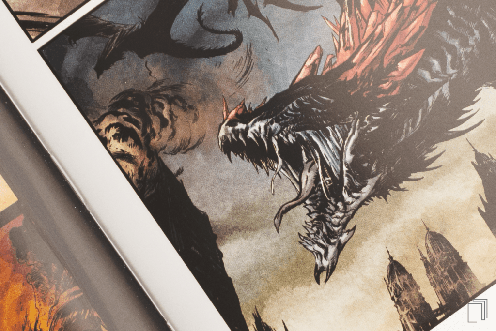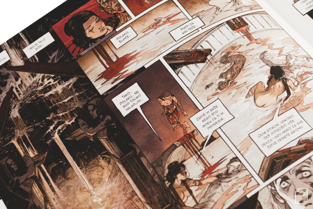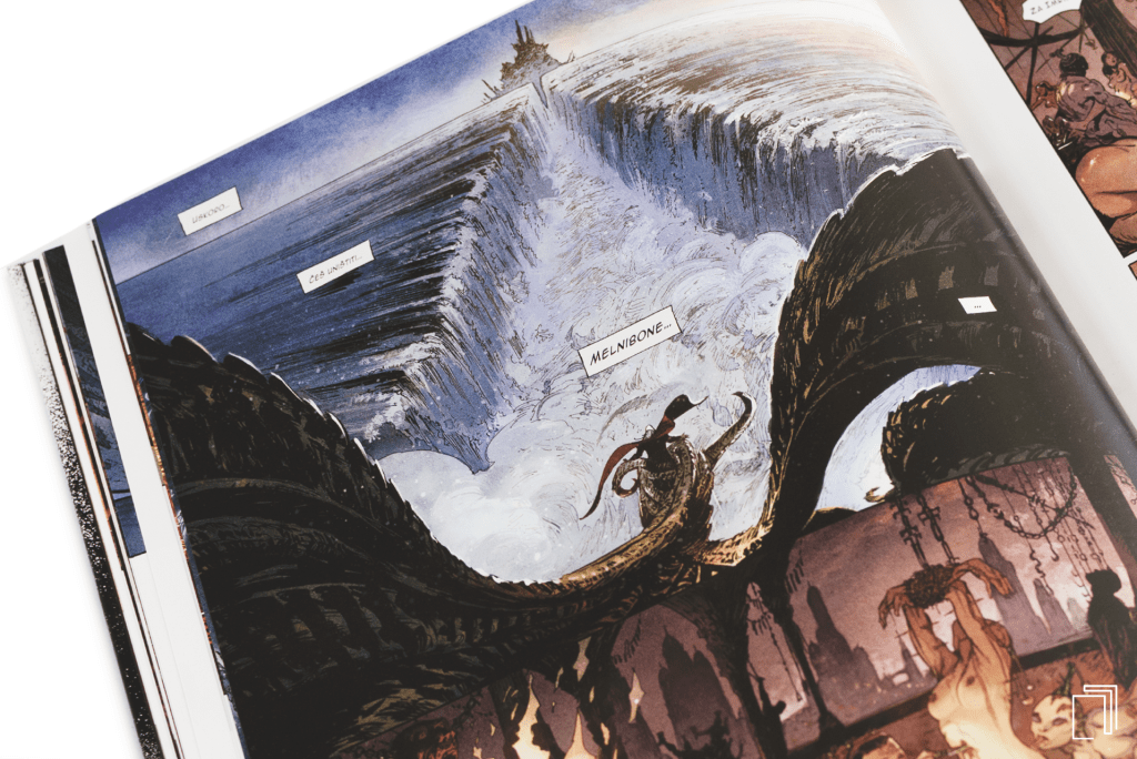 Crtači i koloristi Titan Comicsa stvorili su viziju kraljevstva i grada ispunjenog sa dovoljno golih tela, krvi, seksa i nasilja da Sodoma i Gomora izgledaju kao Diznijev dečiji crtani. Melnibonejska surovost je prikazana sa mračnom detaljnošću koja se koleba na ivici preteranog, ali se nikada ne prevrne preko, prelazeći od umetničkog ka neopravdano grotesktnom. Panel za panelom učiniće da vam vilica padne dok začuđeno gledate u razmeru i nivo detalja u arhitekturi, kostimu… svemu, i svaka stranica je veličanstveno udubljenje u tamu i bogatu dekadenciju Usnulog grada. Melniboneu je dat zapanjujući vizuelni život.